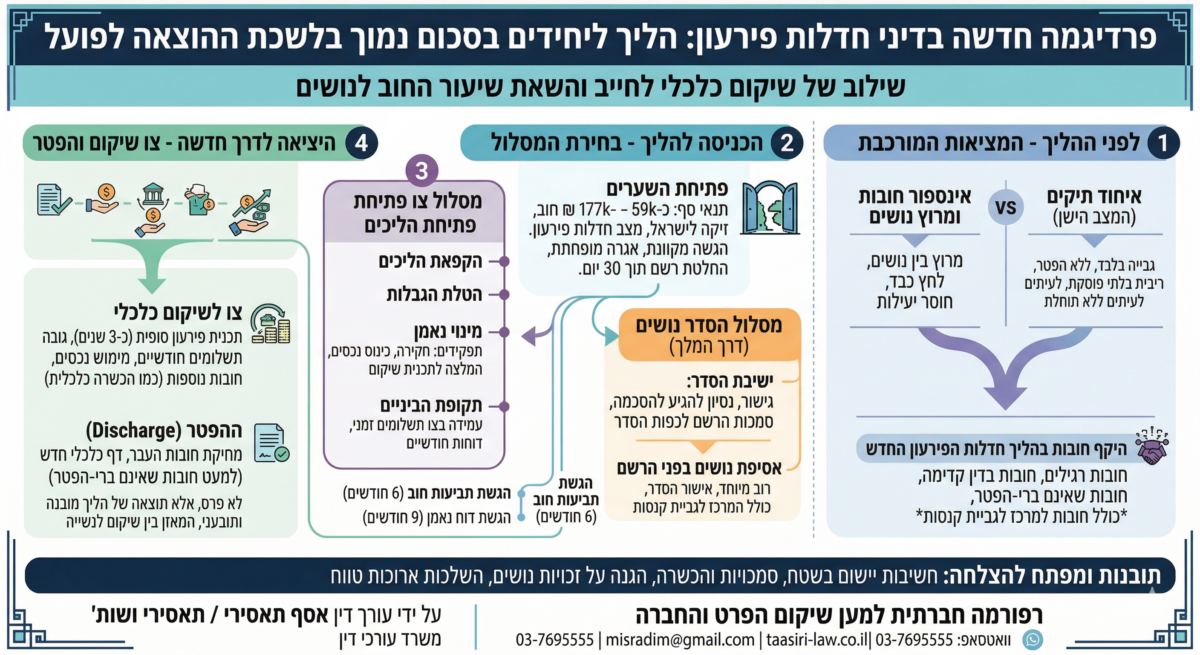 כניסתו לתוקף של חוק חדלות פירעון ושיקום כלכלי, התשע"ח-2018 (להלן: "החוק" או "חוק חדלות פירעון") ביום 15 בספטמבר 2019, מסמנת נקודת מפנה היסטורית ורעיונית בדין הישראלי. המעבר מפקודת פשיטת הרגל [נוסח חדש], התש"ם-1980, אינו אך שינוי טכני או עדכון חקיקתי; הוא מבטא שינוי תפיסתי עמוק, המסיט את מרכז הכובד מהתמקדות כמעט בלעדית בכינוס נכסי החייב וחלוקתם לנושים, לעבר מודל דואלי המציב את שיקומו הכלכלי של החייב כמטרה מרכזית, לצד התכלית המסורתית של השאת שיעור החוב שייפרע לנושים. תכלית דואלית זו, המעוגנת בסעיף 1 לחוק, מהווה את חוט השני השזור לאורכו של ההסדר החדש, ובפרט בהליך הייחודי המתנהל בלשכות ההוצאה לפועל.